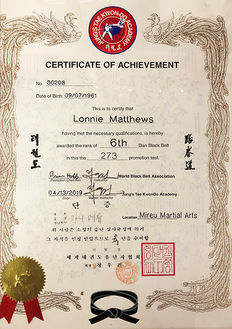 Transition to World Taekwondo: In a commitment to learning the World Taekwondo (WT), Kukkiwon standards, voluntarily demoted to White Belt on January 4, 2006.
